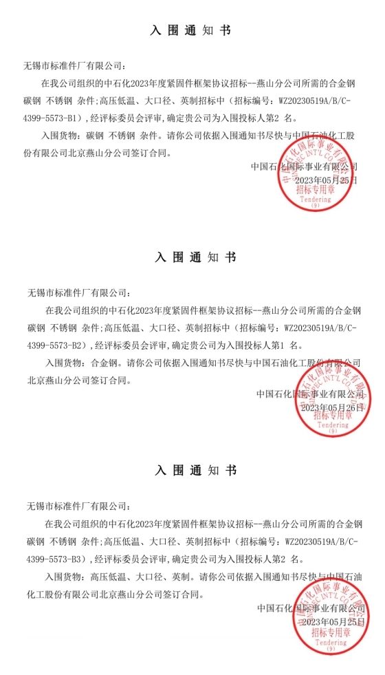 熱烈慶祝:我司在“中石化2023年度緊固件框架協(xié)議招標”成為入圍投標人!